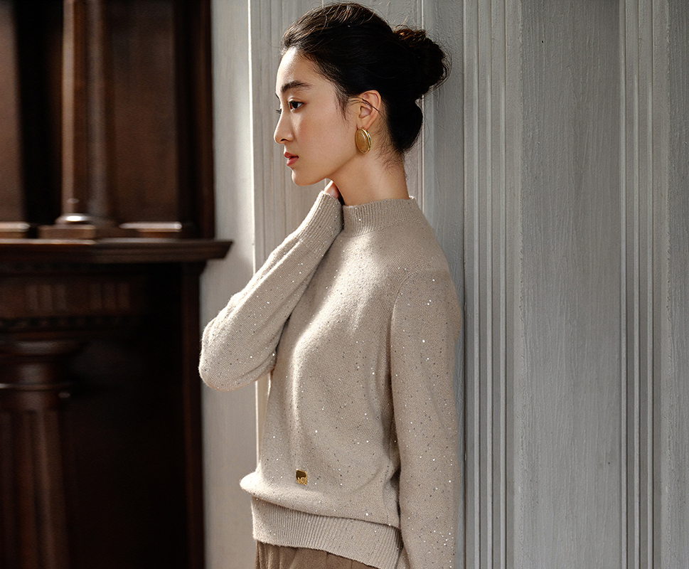 谭飞重视每一款产品的体感,成衣生产完成后,经过穿十洗十,确认体感舒适、品质无瑕疵才量产。以羊绒、羊毛、真丝、三醋酸、埃及棉、进口四面弹、土耳其牛仔等进口面料为主。加上具原创设计感的图案,把细节演化成时尚的语言,展现一种时尚且不失优雅的女性化风格。